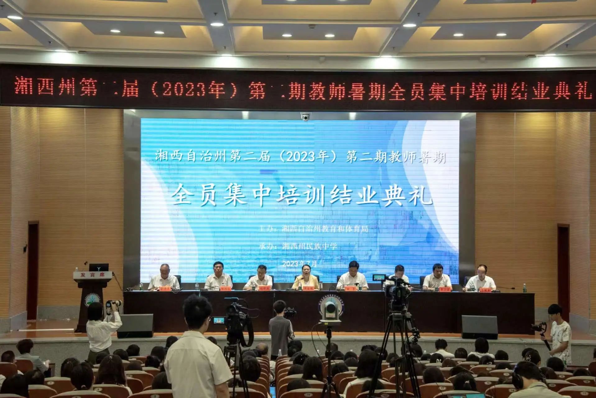 7月20日,湘西州第二届(2023年)教师暑期全员集中培训(第二期)结业典礼在州民族中学举行。州委常委、州委统战部部长吴凌频,州教体局党组书记、局长田勇,局党组成员、副局长刘修洪,州纪委监委驻州教体局纪检监察组组长、党组成员吴俊锋,副局长向仍淼,局党组成员、总督学卓小波,局机关、局二级机构及州直学校、八县市部分干部教师在现场参会。