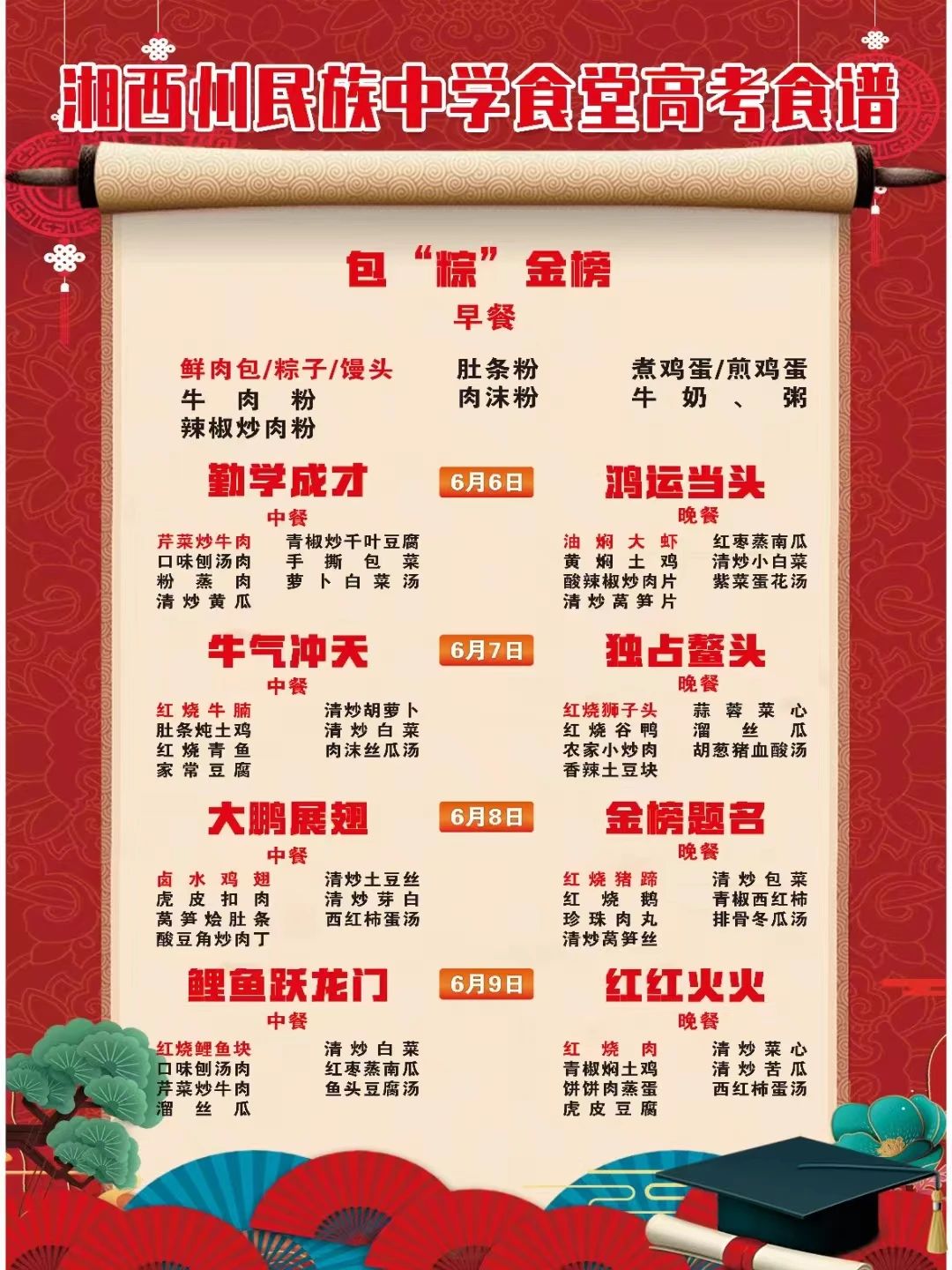 为保证学生吃得营养、吃得健康,6月6日至9日,学校食堂为考生提供免费营养餐。学校领导班子提前部署,全面调度,多次召开专题会议。学校食堂在州市场监督管理局专业人员指导下,精心设计,特别推出“高考加油套餐”,不仅菜品丰盛,而且营养均衡。食堂工作人员温馨服务,为高考学子保驾护航。